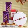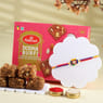 A perfect blend of tradition and trend, this Designer Rakhi is crafted to charm. The centrepiece blooms with a circular red and gold base, adorned with shimmering white stones and a central pearl, giving it a regal glow. Surrounded by vibrant petal motifs in navy blue, yellow, and green, it exudes a festive vibrance. The red and blue threadwork further enhances its bold, joyful vibe. Whether near or far, this Rakhi promises to light up your brother’s wrist with love, colour, and unmatched style this Raksha Bandhan.