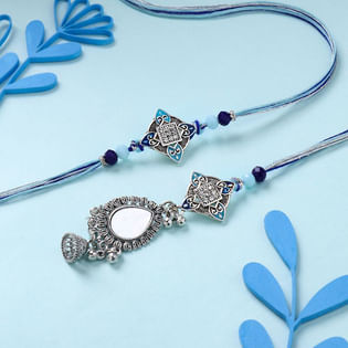Blue Mirror Work Couple Rakhi Set-USA