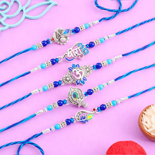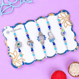 Five Blue N Silver Rakhis With Sweets N Almonds