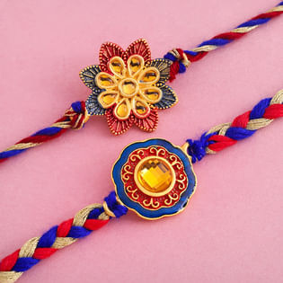 Vibrant Hues Floral Rakhi Duo With Kaju Katli